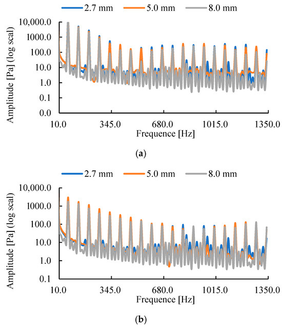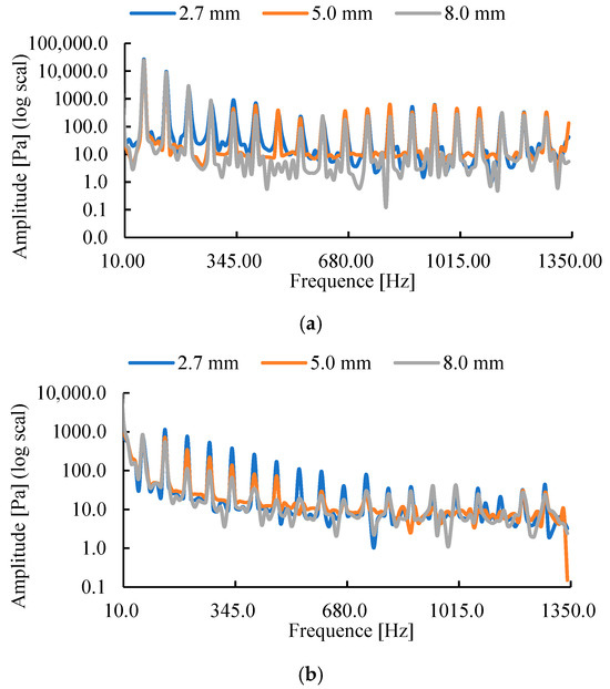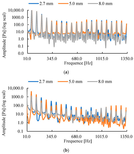 Figure 16 and Figure 17 display the frequency–domain characteristics of impeller leading-edge (LE) and trailing-edge (TE) pressure pulsations under design (1.0Qdes) and high-flow (1.2Qdes) conditions. The LE spectral energy concentrates primarily within 0–300 Hz, with blade-passing frequency dominating the response. As quantified in Table 5 and Table 6, LE fundamental amplitude (blade-passing frequency ) decreases with increasing blade root clearance δ, though less markedly than at low flow: the δ = 2.7 mm configuration exhibits 4.7% (1.0Qdes) and 6.9% (1.2Qdes) reductions relative to δ = 8.0 mm. Conversely, TE spectral energy distributes across 0–600 Hz, while its fundamental amplitude demonstrates non-monotonic variation (initial increase followed by decrease) with δ. This response stems from clearance-induced modifications to rotor–stator interaction. At 1.0Qdes, TE amplitude changes by +42.2% (δ = 5.0 mm) and −55.9% (δ = 8.0 mm) relative to δ = 2.7 mm; corresponding 1.2Qdes variations are +7.2% and −37.0%.