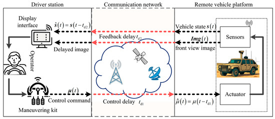 However, the development of TGVs still faces two significant challenges, i.e., communication delays and low transparency [9,10,11]. A typical schematic of TGVs is shown in Figure 1. TGVs operate in complex, hazardous environments where communication delays are common due to long-distance wireless transmission and terrain interference [12]. During operation, driver commands and feedback signals (e.g., vehicle status, video feed) experience control delay and feedback delay , resulting in a round-trip delay of . This delay causes temporal misalignment between operator input and vehicle response. While short delays can be mitigated through human prediction [13], increased delay disrupts the perceived input–response relationship, raising cognitive load and impairing control adaptability [14,15]. Performance drops notably when video delay exceeds 200 ms [16,17].
