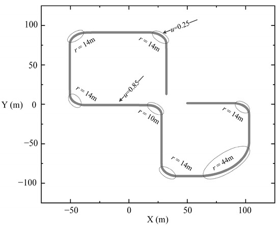 As depicted in Figure 5, the experimental test route consists of several straight-line segments alternating with curved segments. The straight-line segments primarily evaluate the teleoperated system’s steady-state performance under constant input conditions, whereas the curved segments are designed to assess the system’s transient response under step or ramp input conditions. The total length of the test route is 588 m, including six sharp curves with radii ranging from 10 to 14 m and one gentle curve with a radius of 44 m. These variations in curvature introduce differing levels of maneuvering difficulty to increase task complexity. This design facilitates a more comprehensive elicitation of participants’ physiological responses and enables effective observation of both fluctuation patterns and recovery dynamics in physiological indicators.