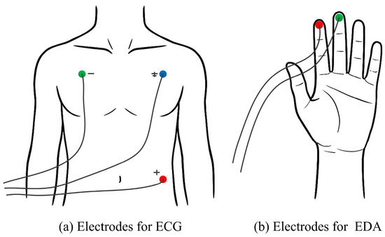 The raw SC signal was down-sampled to 25 Hz and smoothed by a median smoothing filter with a 1 s width to eliminate movement artifacts [50]. To eliminate individual differences in EDA signals, they were normalized according to the following equation (Standardized EDA = (EDA value—minimum value)/(maximum value—minimum value)). The maximum and minimum values of EDA refer to the minimum value of the subject’s resting baseline and the maximum value of all task phases, respectively. The phasic component of the EDA was extracted using a 0.05 Hz high-pass filter from the standardized EDA [28]. The ECG signal was down-sampled to 200 Hz, and then a 0.5–35 Hz bandpass filter was used to remove the noise [51].