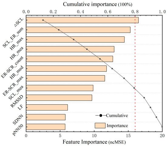 Although LASSO regression is effective for feature selection, it is sensitive to multicollinearity and only captures linear relationships. To address this, a second-stage analysis using a Random Forest model (n_estimators = 500) was conducted to assess the importance of the LASSO-selected features. As shown in Figure 9, the top eight features account for over 80% of the cumulative importance. Therefore, these eight features (△SCL, SCL_ER_sum, HR_max, HR_mea, ER-SCR_count, HR_med, ER-SCR_max, and SCL_mea; see Table 1 for details) were selected as the core physiological feature set for subsequent analysis.