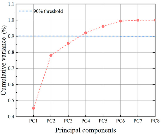 In the third stage, principal component analysis (PCA) was applied to the core feature set to reduce dimensionality. As shown in Figure 10, the cumulative variance explained by the first four principal components (PC1–PC4) exceeded 90%, indicating that they preserved most of the data’s information. Beyond these components, the curve leveled off, and additional components contributed little, suggesting they could be disregarded.