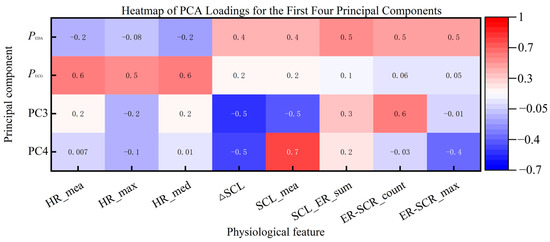 As shown in the loading plot (Figure 11), PEDA (PC1) was primarily composed of EDA-related features (△SCL, SCL_mea, SCL_ER_sum, ER-SCR_count, and ER-SCR_max), all of which had high positive loadings, while ECG-related features contributed minimally and negatively. This suggests that PEDA predominantly captures variability in electrodermal activity and reflects the main trends in EDA-related physiological processes.