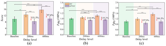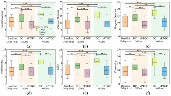 The experiment was conducted in a 2 × 2 within-subjects design to determine the effect of delay level and control method on the operator’s workload. The control method consists of two levels, i.e., {DC, ePTGC}, where DC refers to a direct control framework without any aids. To ensure the smooth implementation of the experiment and to capture a clear contrast between high- and low-delay conditions, the delay levels were selected based on pilot study results. Specifically, 200 ms (low delay) and 600 ms (high delay) were chosen as the experimental conditions, as they represent threshold values at which the impact of delay and transparency on teleoperation performance can be clearly observed. In addition, these delay values align with typical ranges encountered in communication networks [34,46,47] and are consistent with those reported in previous delay-related studies [37,38,48].
