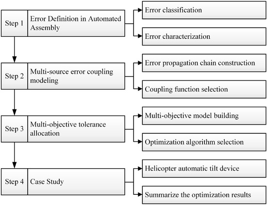 Overall implementation architecture of the proposed tolerance optimization method for automated assembly. The process includes four steps: (1) error definition and classification in automated assembly; (2) modeling of multi-source error coupling and propagation; (3) multi-objective tolerance allocation through simulation and optimization; and (4) application to a case study involving a helicopter automatic tilt device. Each step is further divided into key tasks as shown.