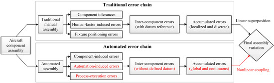 In the assembly process of complex aircraft components, the accumulation and propagation of errors directly determine the geometric accuracy and functional coordination performance of the final product. Significant differences exist between traditional manual assembly and modern automated assembly in terms of error formation mechanisms and propagation paths [23], as shown in Figure 2.