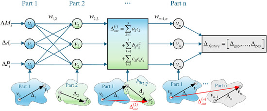 Each step of the assembly process is mapped to a network node in sequence. Each directed edge represents the error transmission direction from node to the subsequent node and is assigned a weight to quantify the impact of the upstream error on the downstream step. At node , a semi-parametric polynomial coupling function is defined to map the three types of input errors to output deviations, as shown in Equation (14).