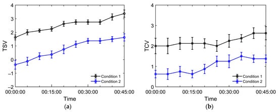 Figure 10 displays the mean thermal sensation votes (TSVs) and thermal comfort votes (TCVs) over time for the four test conditions, based on ISO 10551 standard [35], with eight participants providing votes every 5 min. The TSV and TCV scales are presented in Table 5.