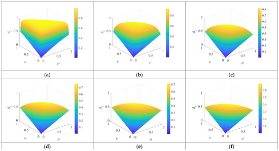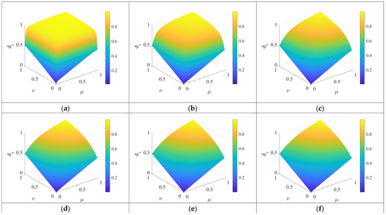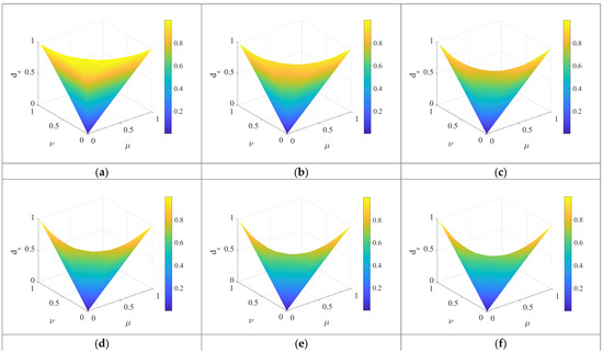 Assume that the IFSs on are given by = and . Then the ISIFDisM is equal to . To illustrate the changing trend of the distances between and , the parameter values are also chosen to plot the relationship between , and , as depicted in Figure 3. It is revealed that except for the case when . In decision-making, can represent an assessment that focuses exclusively on a “positive attribute”: μ quantifies the degree of belief in the strength of an alternative (e.g., “energy efficiency” of a device). Conversely, captures an assessment centered on a “negative attribute”: ν measures the degree of belief in a weakness (e.g., “energy consumption” of the device). The distance quantifies the tension or discrepancy between these opposing attributes. A higher indicates a greater imbalance. When , . This edge case represents a scenario where an alternative simultaneously exhibits maximum strength in the positive attribute and maximum weakness in the negative attribute (e.g., a product that is both “perfectly efficient” and “perfectly costly”). Such a situation is often paradoxical in real-world decisions, signifying an extreme conflict that may necessitate re-evaluation (e.g., revising cost estimates or efficiency claims) prior to making a choice.