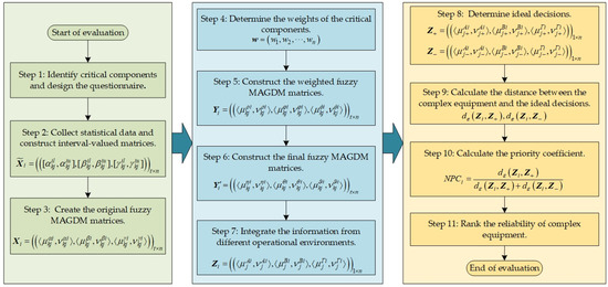 Fuzzy comprehensive evaluation methods have become increasingly prevalent in reliability assessments, effectively addressing the complexities and environmental uncertainties. Duan et al. [9] introduced an integrated approach combining interval-valued triangular fuzzy weighted mean and evidence networks to handle uncertainty in component failure rates. Wang et al. [10] proposed a similarity-based cloud model to assess the operating conditions of complex mechatronic systems. By integrating objective and subjective factors, this model evaluates reliability by calculating the similarity between actual and standardized cloud models, offering a novel approach to address data deficiency. Yue [11] presented a VIKOR-based software reliability framework utilizing picture fuzzy sets for questionnaire information. He et al. [12] proposed a multi-level fuzzy evaluation model with combined authorization to assess the reliability of integrated energy systems. Zhang et al. [13] proposed a reliability-based group decision-making approach using two-dimensional linguistic information and quantum probability theory to assess delivery risks. Jia and Jia [14] developed an innovative multi-attribute group decision-making evaluation model for ship equipment reliability assessment in complex and diverse standard environments, based on symbolic information and an improved TOPSIS framework. Recent studies demonstrate that, in multi-environment scenarios, the reliable assessment of complex equipment demands balancing environmental parameter fluctuations, multi-attribute coupling, and expert cognitive fuzziness. Fuzzy multi-attribute group decision-making (MAGDM) methods provide effective tools for this purpose. These methods can accurately capture the gray features of the environment-reliability link using fuzzy expression tools, such as fuzzy linguistic sets, symbolic information, and cloud models. Additionally, they integrate dynamic performance indicators, such as failure rates under environmental stress, repair-response times, and degradation rates from different environments. Through group decision-making, they reduce uncertainties from single-environment assumptions and data deficiencies. Furthermore, they support the dynamic optimization of multi-environment weights, attribute correlations, and expert consensus, enhancing the adaptability and engineering guidance of the assessment results.