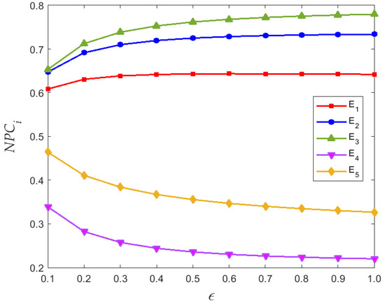 Figure 5 demonstrates that as the parameter increases, the reliability ranking order of remains consistent and distinguishable. Since serves as a discriminative parameter for highlighting the disparities among IFNs, a larger value significantly accentuates these differences. Consequently, with the increase in , the differences among the engines become more pronounced, which facilitates the identification of the engine with the highest reliability. These results align with the theoretical expectations, validating the rationality of the proposed analytical framework.