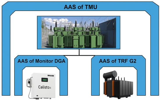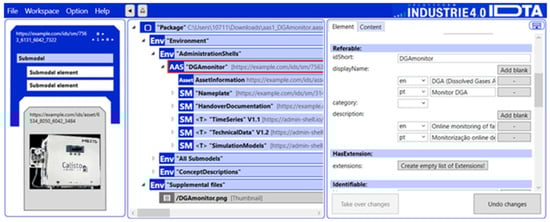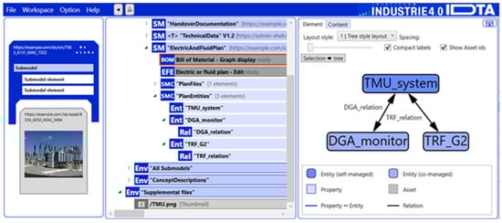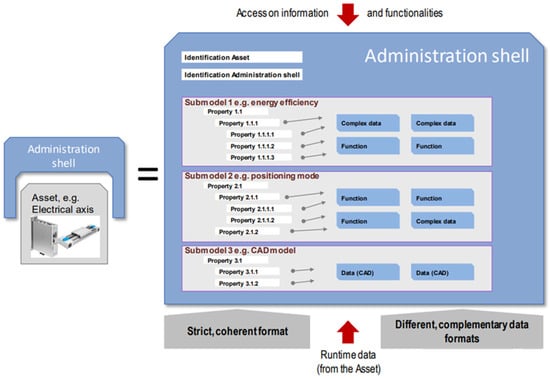 The AAS was one of the main results of the work carried out as part of the Plattform Industrie 4.0 project. From the first IDTA working group, with the theme of “Reference Architectures, Standards and Norms”, an AAS is defined as a standardized digital representation of an asset, and a pillar of interoperability between the applications that manage manufacturing systems. As can be seen in Figure 1, this representation identifies the management shell and the assets it represents, stores digital models of various aspects (submodels), and describes the technical functionalities exposed by the management shell and the respective assets []. In this way, the main function of an AAS is to implement DTs in the context of Industry 4.0.