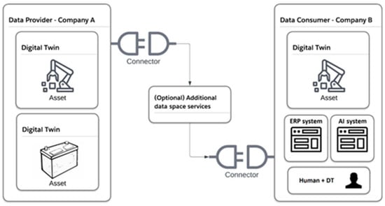DTs and IDS connectors form the first pair of elements that enable the inter-connection of these technologies, and can be employed within an organization or in a cloud infrastructure, and used independently. However, DTs generally represent a physical asset of the organization, while IDS connectors are the portals to DSs across organizational boundaries []. In this way, Figure 2 simplifies the schematic of this interconnection.