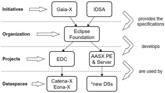 As has been explored, several organizations have tackled the challenge of virtual representation of a real entity by developing specifications or standards for it, while others have tackled the development of a DS. The concepts of Data Spaces defined by IDS and Gaia-X support interoperability and secure data exchange through integration with existing identity and trust management services []. In the Gaia-X ecosystem, the Eclipse Data Space Connector adopts both IDS specifications and Gaia-X-relevant protocols. Likewise, various implementations of the IDS connector are available and documented through the IDSA repository []. Naturally, some of these specifications or standards are more compatible with certain DS architectures. For this reason, the integration of the AAS standard with IDS elements is chosen, which is studied in the following chapters.