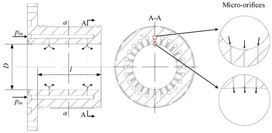 The diameter of the micro-orifices is less than 0.1 mm, which requires a larger number and a denser arrangement to achieve sufficient load capacity and stiffness. Notably, the number and density of the micro-orifices are limited owing to practical manufacturing constraints. To further enhance the performance as much as possible, each row of micro-orifices is evenly divided into 24 groups of three, as depicted in Figure 1. This arrangement ensures an optimal balance between the number and density of the micro-orifices, enhancing the overall performance of the bearing.