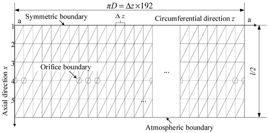 Unfold the air film along the axis direction to a rectangle, divide the rectangle into two halves along the symmetry line a-a, and take one half as the computational domain, as illustrated in Figure 2. The x-direction signifies the bearing axial direction of the bearing, the z-direction denotes the circumferential direction. In the following, the atmospheric boundary, symmetric boundary and orifice boundary condition (sp, ss, sd) are displayed in some detail: