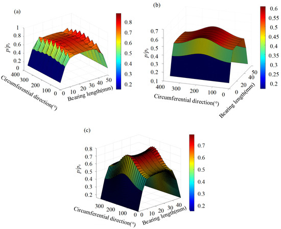 It is illustrated in Figure 3 that the dimensionless pressure distribution of the air film generated by three different restrictor configurations under an eccentricity ratio of 0.2 and an air supply pressure of 0.6 MPa, and the air film thickness is 15 μm. Each restrictor configuration has two rows of orifices. In Figure 3a, there are 8 orifices uniformly distributed in each row, with an orifice diameter of 0.2 mm, and an air chamber is designed at the outlet of each orifice to realize the orifice throttling, as shown in Figure 2a of reference [23]; in Figure 3b, there are 24 micro-orifices uniformly distributed in each row, with a micro-orifice diameter of 0.05 mm; in Figure 3c, there are 72 micro-orifice s in each row, with a group of three, and the inter-hole between each group are equal, with a micro-orifice diameter of 0.05 mm. As is shown in Figure 3, the dimensionless pressure distributions of different restricting methods are basically the same, the high-pressure area is concentrated between two rows of orifices. And it is noted that the pressure distribution of the micro-orifice restricted AJBs is smoother, and the pressure range is greater.