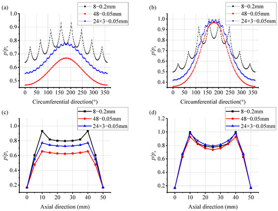It is known that the gas source pressure (ps) is a constant once selected, Sf is also constant after determining the thickness of the air film, and pa is the atmospheric pressure. Assuming that ECSA of a single orifice restrictor is denoted by S, and the micro-orifice diameter is 1/4 of the diameter of a traditional orifice, which leads to a proportional reduction in ECSA of a single micro-orifice restrictor to S/16. Obviously, the total ECSA of the MORs is noticeably lower than that of the TORs. From Equation (13), it can be inferred that as ECSA becomes smaller, the air film pressure decreases, which is consistent with the observed decrease in the MORs outlet pressures in Figure 4a,b. Furthermore, according to Equation (11), an increase in the number of micro-orifices causes an increase in Se, and consequently an increase in the air film pressure. According to the plotted results in Figure 4a,b, the 24 × 3 micro-orifices configuration exhibits higher outlet pressure values than the set of 48 micro-orifices, indicating that the simulation and mathematical analysis results are consistent.