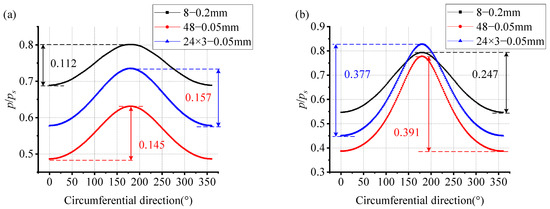 The pressure ranges of the three restrictors in the presence of eccentricity ratio of 0.2 and 0.6, as noted in Figure 6, determines the performance of the AJBs. The air film pressure range reflects the magnitude of the support force of the air film on the core shaft when there is an eccentric and indirectly reflects the performance of the bearing. It can be seen from Figure 7a that, under the eccentricity ratio of 0.2, the 24 × 3 MORs exhibits the highest load capacity, followed by the 48 uniformly distributed MORs, and finally the TORs. However, the load capacity of the 48 uniformly distributed micro-orifices restricting structure surpasses that of the 24 × 3 structure under the eccentricity ratio of 0.6. Both of the above sequences mentioned are consistent with what is presented in Figure 6, leading to the conclusion that MORs are help for the increase in the pressure range of the AJB’s air film, thereby enhancing the overall performance of the journal bearing.