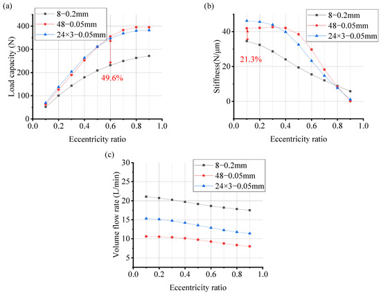 Figure 7 demonstrates the performance of the three restricting structures under different eccentricity ratios, including load capacity, stiffness and flow rate. As is illustrated in Figure 7a, the load capacity increases as the eccentricity ratio increases for all restricting structures. The MORs’ load capacity is always greater than TORs’, with a maximum increase of 49.6%. In addition, as illustrated in Figure 7b, in the range of eccentricity ratio below 0.7, the bearing stiffness of the micro-orifice restricting structure is able to maintain a high level and exhibits at least 21.3% improvement compared with the traditional orifice restricting structure. When the eccentricity ratio is less than 0.3, the 24 × 3 micro-orifice arrangement demonstrates higher load capacity and stiffness than those of the other two arrangements, which proves the rationality and advantages of this design.