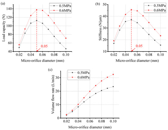 Effect of micro-orifice diameter on bearing performance: (a) Load capacity, (b) Stiffness, (c) Volume flow rate.