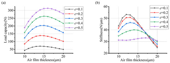 Effect of air film thickness on bearing performance (e is the eccentricity ratio): (a) Load capacity, (b) Stiffness.
