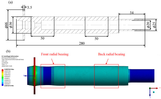 Centrifugal deformation: (a) shaft dimensions (Length Unit: mm), (b) simulation results.