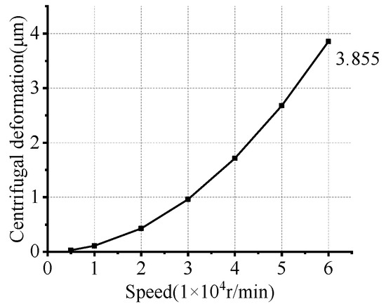 In the process of determining the thickness of journal bearings air film, the deformation caused by the high-speed centrifugal expansion of the core shaft should be fully considered. As illustrated in Figure 11, the centrifugal deformation at a speed of 60,000 r/min is obtained as 3.855 μm, and in designing the air film thickness, this deformation should be considered to ensure the optimal thickness. Based on the bearing stiffness analysis, the optimal air film thickness is predicted to be 12 μm, as demonstrated in Figure 9b. Therefore, for an aerostatic spindle operating at a speed of 60,000 r/min, the air film thickness should be set to 15–16 μm to mitigate the reduction in deformation of the air film thickness caused by the dynamic effects.