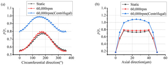 Dimensionless pressure distributions of different operating conditions (under the eccentricity ratio of 0.2, supply pressure of 0.6 MPa and air film thickness of 15 μm) : (a) Circumferential direction, (b) Axial direction.