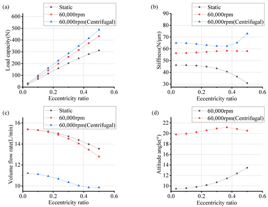 Performance of journal bearing in different operating conditions: (a) Load capacity, (b) Stiffness, (c) Volume flow rate, (d) Attitude angle.
