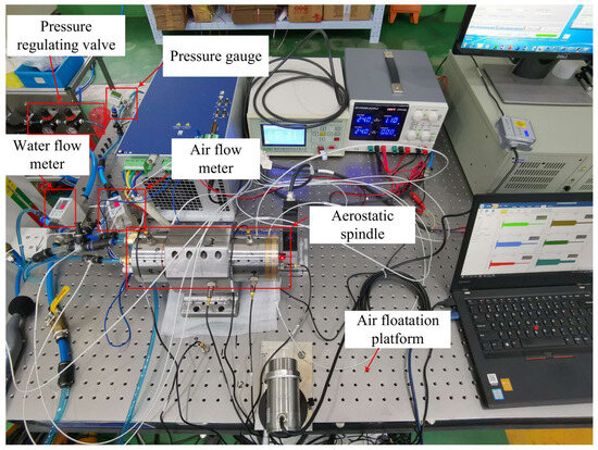 It is difficult to apply a load to the spindle and accurately measure the corresponding displacement and other characteristics at high speed, while it is relatively convenient to measure the volume flow rate. Therefore, this paper considers the dead weight of the rotor and the motor as the load to estimate the eccentricity, and the centrifugal deformation of the rotor obtained by simulation in the presence of various rotational speeds serves as a reference to recalculate the air film thickness. Subsequently, the rationally established mathematical model in this paper is employed to evaluate the volume flow rate under different rotational speeds. To this end, the experimental device in Figure 14 is constructed to measure the volume flow rate.