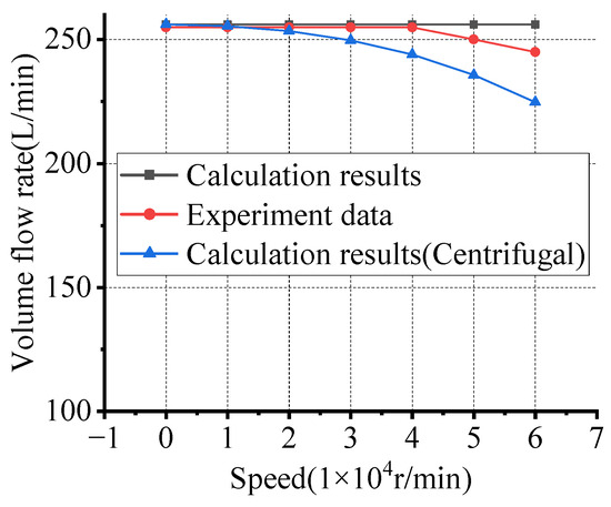 As illustrated in Figure 15, the error between the calculated data of the proposed model and the experimental results does not exceed 8.3%, which proves the reasonableness of the model. As the centrifugation is not considered, the volume flow rate does not alter with the change in the rotation speed, and its value is almost stable. After considering the centrifugal effects, with the growth of spindle speed, the dynamic pressure effect gradually intensifies, and the trend of volume flow rate reduction becomes increasingly apparent. Such a result is consistent with the experimental data and illustrates the conclusions and methods regarding the centrifugal effects presented in this paper.
