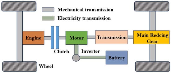 This study adopts a typical parallel hybrid powertrain configuration, as illustrated in Figure 1. The system comprises a diesel engine, a clutch, an integrated motor-generator unit, an 8-speed automated manual transmission (8AMT), and a high-capacity battery pack. In this architecture, the clutch is positioned between the internal combustion engine and the electric motor. This layout allows the motor to operate independently when the clutch is disengaged, enabling pure electric driving or low-speed operation. When higher power output is required, the clutch engages, allowing the engine and motor to work in tandem to transmit power to the wheels via the transmission. Additionally, under specific operating conditions, the engine can charge the battery through the motor functioning as a generator, with electrical energy transferred via an inverter. This dual-mode drive strategy enables both independent and cooperative operation of the engine and motor, thereby enhancing overall energy efficiency and driving performance. The specific vehicle parameters are shown in Table 1.