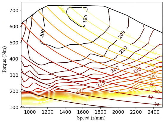 In the equation, represents the instantaneous fuel consumption of the engine, denotes the engine torque and denotes the engine speed. The engine’s instantaneous fuel consumption can be obtained from the corresponding torque and speed at any given moment, as illustrated in Figure 2. The color shades in the figure represent the fuel consumption levels.