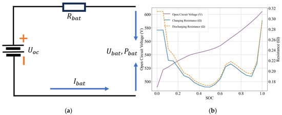 To simplify the battery modeling process, this study adopts an internal resistance model, with its equivalent circuit shown in Figure 3a. Furthermore, the overall battery characteristics as a function of SOC are obtained experimentally and fitted to the curve shown in Figure 3b. The battery output power, current, and SOC at each moment can be calculated using the following equations: