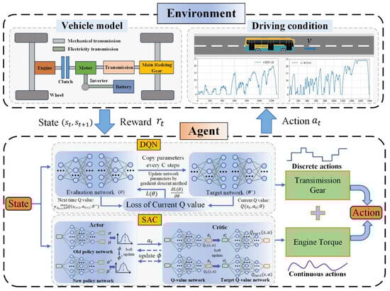 Based on the above research, to further improve the decision-making efficiency and policy stability in the hybrid action space, this paper proposes a joint soft actor–critic (SAC) + DQN architecture. The proposed hierarchical EMS, which integrates SAC and DQN, is capable of simultaneously managing both continuous and discrete action variables, ensuring energy efficiency, battery state-of-charge (SOC) stability, and gear shifting coordination. The main contributions of this paper are summarized as follows: