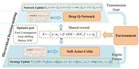 For the energy management problem of parallel hybrid electric vehicles, the primary control targets are the engine and the transmission. In this study, an HRL-based EMS framework is proposed, as illustrated in Figure 4. The design concept involves applying different reinforcement learning algorithms to appropriate subsystems, thereby enabling hierarchical control at the system level. Specifically, the upper-level policy adopts the SAC algorithm to regulate the engine’s output torque, while the lower-level policy employs the DQN algorithm to make gear-shifting decisions for the transmission.