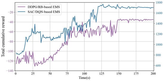 The training process of DRL is essentially a policy exploration method based on trial and error. The agent continuously interacts with the environment to maximize cumulative rewards. Monitoring the trend of cumulative rewards per episode during training is crucial for evaluating the effectiveness of policy learning. When the cumulative reward gradually converges and stabilizes, it is generally considered that the agent has completed the training process. To visually compare the learning capabilities of different EMSs, the evolution of cumulative rewards during training is illustrated in Figure 7. The agents for the two EMS strategies successfully converge at Episodes 119 and 147, respectively, demonstrating the ability to learn effective policies within a hybrid action space. These results indicate the proposed method’s effectiveness in terms of learning efficiency.
