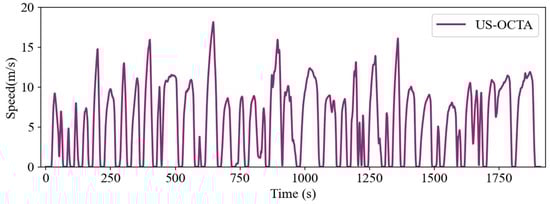 This section conducts a comprehensive performance analysis of the HRL-based EMS through a series of comparative experiments. The Orange County Transit Bus Cycle (US-OCTA) from California is adopted as the test driving cycle, as shown in Figure 8. This cycle exhibits typical characteristics of urban road operation, featuring frequent acceleration and deceleration events. It accurately reflects the dynamic response behavior of transit buses in urban traffic environments. Due to its pronounced speed fluctuations, the US-OCTA cycle offers strong representativeness and reference value for the verification and optimization of gear-shifting strategies.