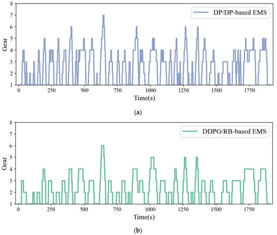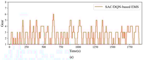 Figure 9 illustrates the AMT gear shift sequences under three distinct energy management strategies. The total number of shifts for the DP-based, rule-based, and DQN-based approaches is 274, 131, and 192, respectively. Compared to the rule-based strategy depicted in Figure 9b, the DP-based method shown in Figure 9a results in significantly higher shift frequency and pronounced oscillations, particularly in the lower gears. This frequent shifting behavior reflects the global optimization objective of the DP method, but it may also lead to reduced driving comfort. In contrast, the reduced shifting activity observed in the rule-based strategy is primarily attributed to its reliance on predefined thresholds for engine speed and torque. While this approach enhances system stability and ride comfort, it lacks the flexibility to adapt to rapidly changing driving conditions. The DQN-based strategy, as illustrated in Figure 9c, strikes a balance between shift frequency and dynamic responsiveness. Notably, during the period between 1500 s and 1700 s, which features frequent acceleration and deceleration, it exhibits smooth and adaptive gear transitions that closely follow the vehicle speed variations shown in Figure 8. This behavior highlights the DQN agent’s ability to generalize to transient states and make context-aware decisions in real time, thereby maintaining vehicle performance while improving ride comfort.
