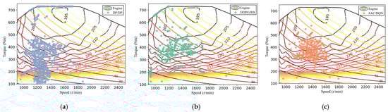 Engine working points of three different EMSs. (a) DP/DP-based EMS. (b) DDPG/RB-based EMS. (c) SAC/DQN-based EMS.