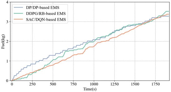 The engine operating points are shown in Figure 10. The DP/DP-based EMS exhibits a wide distribution of operating points, with a concentration in regions of low fuel consumption and high efficiency. In contrast, the DDPG/RB-based EMS exhibits a broader dispersion of operating points, with most points located in areas of higher fuel consumption. This is attributed to the rule-based shifting strategy, which relies on predefined knowledge and lacks adaptability to complex driving conditions. For the SAC/DQN-based EMS, the use of step-by-step control results in a more concentrated distribution of operating points, reflecting a compromise among various optimization objectives. Moreover, with a more proactive shifting strategy, a higher proportion of efficient operating points is achieved, leading to improved average engine efficiency. As illustrated in Figure 11, the SAC/DQN-based EMS demonstrates energy consumption performance that lies between that of the DP/DP-based and DDPG/RB-based strategies. As shown in Table 4, the proposed method exhibits only a 3.06% performance gap compared to the DP/DP-based EMS, while significantly improving computational efficiency by 66.49%.