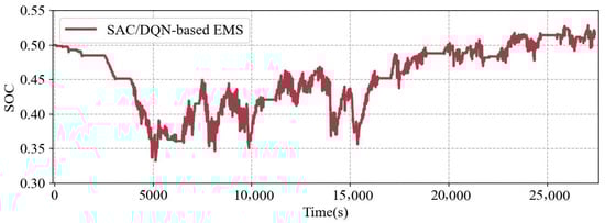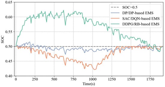 Figure 12 shows the SOC trajectories of the three different EMS strategies under the NEDC driving cycle. As illustrated, all three EMS strategies converge to a final SOC value close to the predefined reference value of 0.5. The decisions made by the proposed EMS closely align with those of the DP benchmark. Compared to the DDPG/RB-based EMS, the proposed method exhibits a more stable SOC trajectory, with smaller fluctuations throughout the entire cycle.