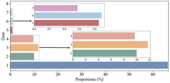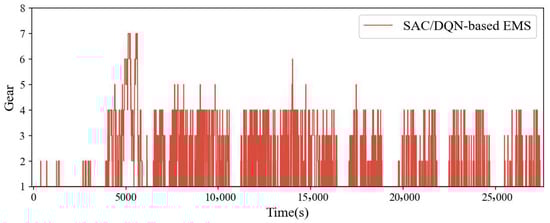 Figure 15 presents the trajectories of engine output power, motor power, and fuel consumption. The engine exhibits clear intermittent operation, with frequent start–stop transitions that avoid prolonged operation under low-efficiency conditions. SAC effectively addresses complex, continuous decision-making problems by leveraging the entropy term to balance exploration and exploitation. It regulates high-frequency action selection, ensuring system responsiveness and improving energy recovery efficiency. Figure 16 illustrates the AMT gear shift sequence under DQN control. The transmission control strategy demonstrates clear logic and responsiveness. Figure 17 illustrates the usage distribution of each gear under the test driving conditions. Due to the frequent stop-and-go nature of urban bus operations, the vehicle spends a significant amount of time at low speeds, resulting in a high usage rate of 1st gear, accounting for 66.30%. The usage proportions of 2nd, 3rd, and 4th gears are relatively balanced—9.97%, 11.72%, and 9.68%, respectively—indicating that the system operates with a certain frequency in the medium-speed range and is capable of achieving smooth gear transitions and effective power output matching. The usage rate of higher gears is comparatively low, which aligns with the overall low-speed characteristics of the test cycle and the infrequent occurrence of high-speed cruising. This further validates that the proposed gear-shifting strategy can intelligently adapt gear selection to the actual driving conditions. These results highlight the excellent adaptability of the proposed strategy across diverse driving conditions.
