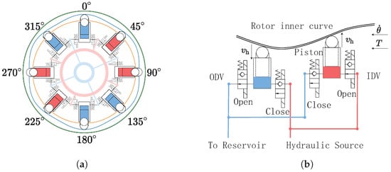 Schematic diagram of a digital radial piston hydraulic motor. (a) Digital motor sectional drawing. (b) Circumferential view.
