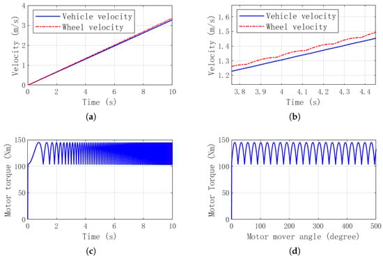 (a) Velocity of vehicle and wheel. (b) Zoom view of (a). (c) Torque vs. time. (d) torque vs. motor angle.