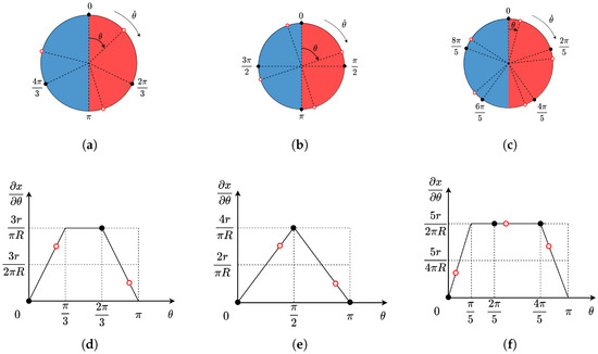Subfigure (d), (e), (f) characterize the mathematical correspondence between piston phase orientation and the partial derivative of the cam profile, exhibiting exact conformity with the graphical representation. The black solid dots and red hollow circles denote the piston phase distributions for two distinct operational phases. Under these geometric constraints, the motor’s instantaneous displacement remains invariant—thereby eliminating torque ripple entirely.