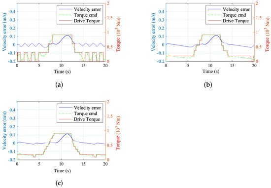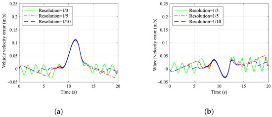 Figure 9 illustrates the impact of different torque resolution levels on the vehicle speed tracking error and the fluctuation of wheel speed. An increase in resolution helps to mitigate the oscillations near the system’s steady-state point and enhances the tracking accuracy of the system.
