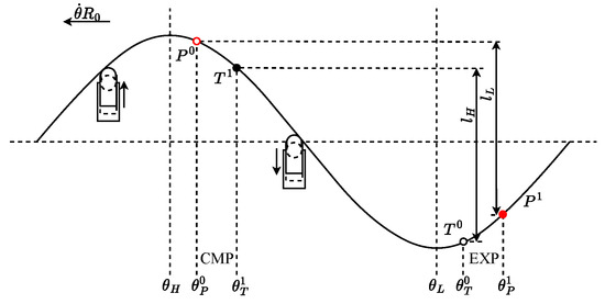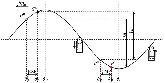 The radial digital piston hydraulic motor of this configuration necessitates precise regulation of the distributor valve’s opening and closing in order to alter the connection dynamics between the piston chamber and the hydraulic source. Let denote the pressure within the piston chamber. When , the objective is to optimize by exclusively linking the piston to the high-pressure oil source, while ensuring that the IDV remains open, under the assumption that the pressure in the piston chamber aligns with that of the oil source. Conversely, when , the aim is to minimize by diverting the piston solely to the return oil; the low-pressure distributor valve remains open, thereby aligning the pressure in the piston chamber with the return oil pressure. Figure 2 illustrates the ideal power curve of the piston unit alongside the corresponding distribution relationship.