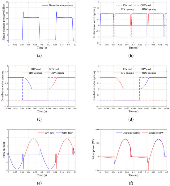 Figure 20 presents the simulation results for flow distribution method 4. As illustrated in Figure 20a, the pressure within the piston chamber exhibits no spikes, indicating a smooth switching process. Figure 20e reveals that the flow distribution valve experiences neither positive flow peaks nor negative flow during instantaneous measurements. Moreover, Figure 20f demonstrates that the output power of the motor closely aligns with the input power, suggesting that this flow distribution method possesses exceptionally high flow efficiency.